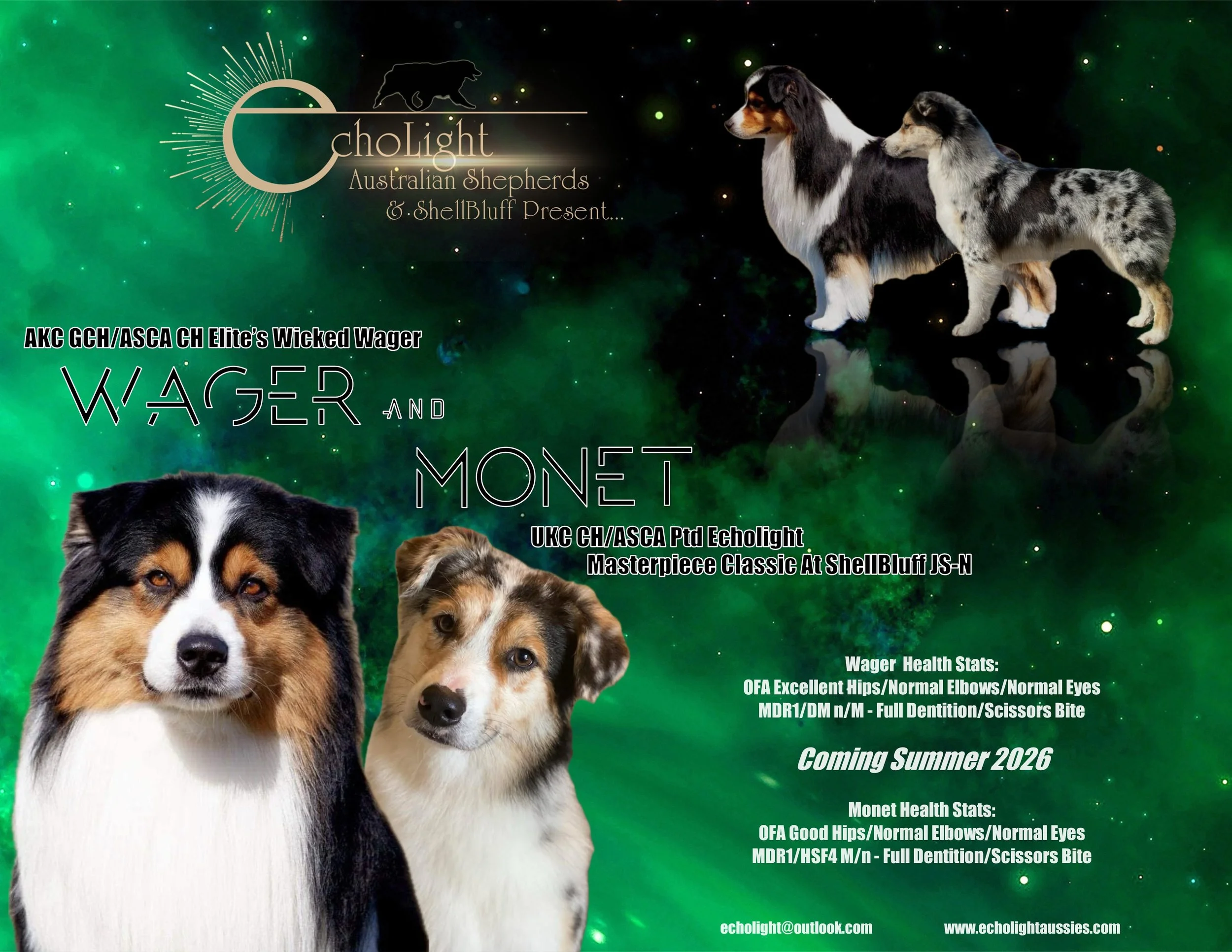 Accepting applications for show, performance, and companion homes. Blue merles and black tricolors expected. Puppies from this litter will be $2500.
